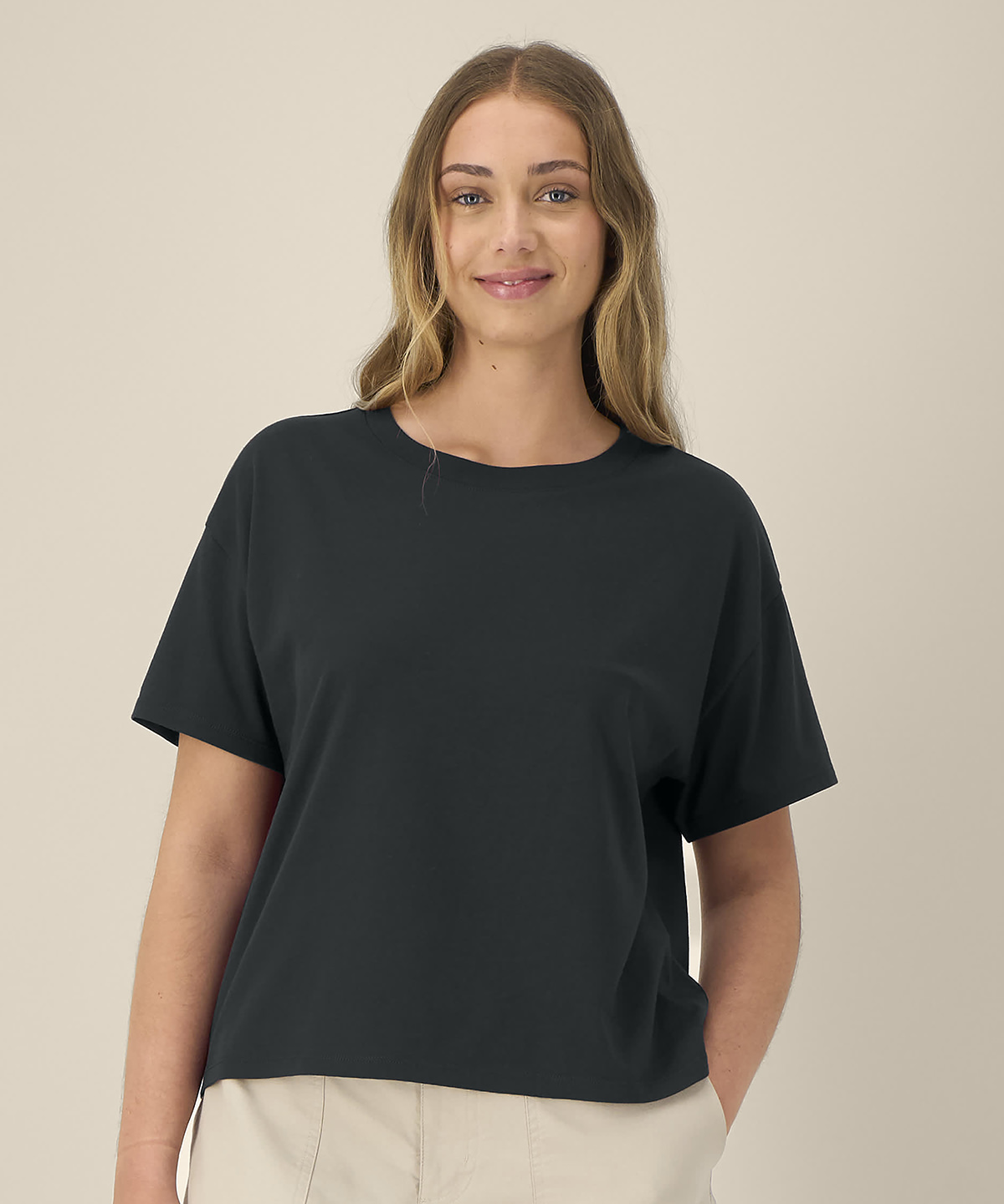 Women’s cotton modal t-shirt. Set-in sleeves. Longer back with curved hem. 1×1 rib at collar. Self-fabric back neck tape. Twin-needle topstitching at sleeve cuffs and hem. Contains 60% OCS-certified organic cotton, certified by Control Union CB-CUC-1393082. Contains 40% Modal (TENCEL™).