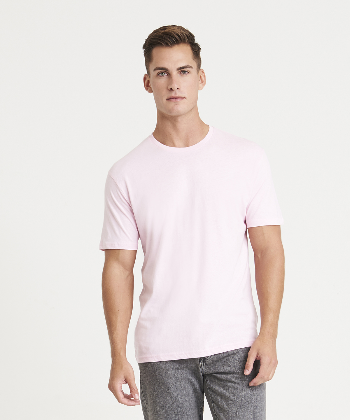 Modern fit. Short sleeves. Side seams. Taped neck. Ribbed crew neck. Twin-needle stitching detail on sleeve and bottom hem. Size label only for easy rebranding – colour coded black for unisex.