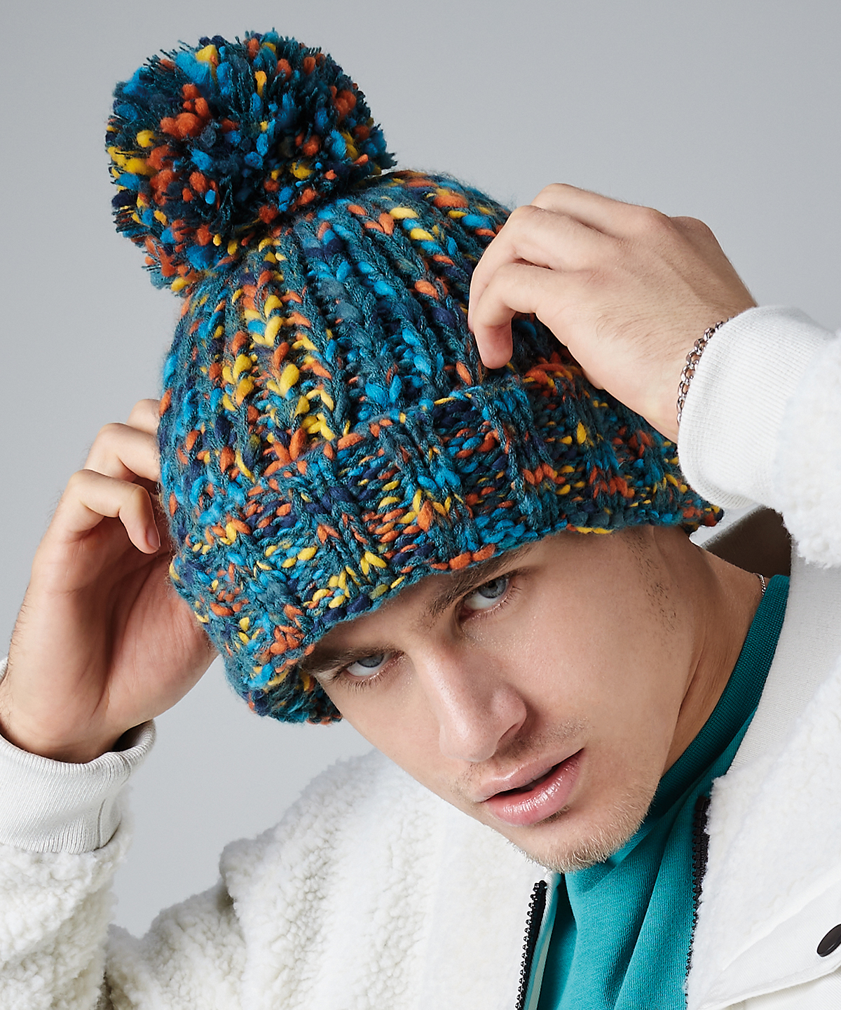 The twister pom pom beanie gives casual headwear an instant colour pop just in time for the cold weather. This Alpine-ready beanie includes a choice of seasonal colour palettes, each with a heavyweight multi-yarn cable knit design and luxury pom pom detail. The cuffed design and tear-out label also offers numerous decorative options.
