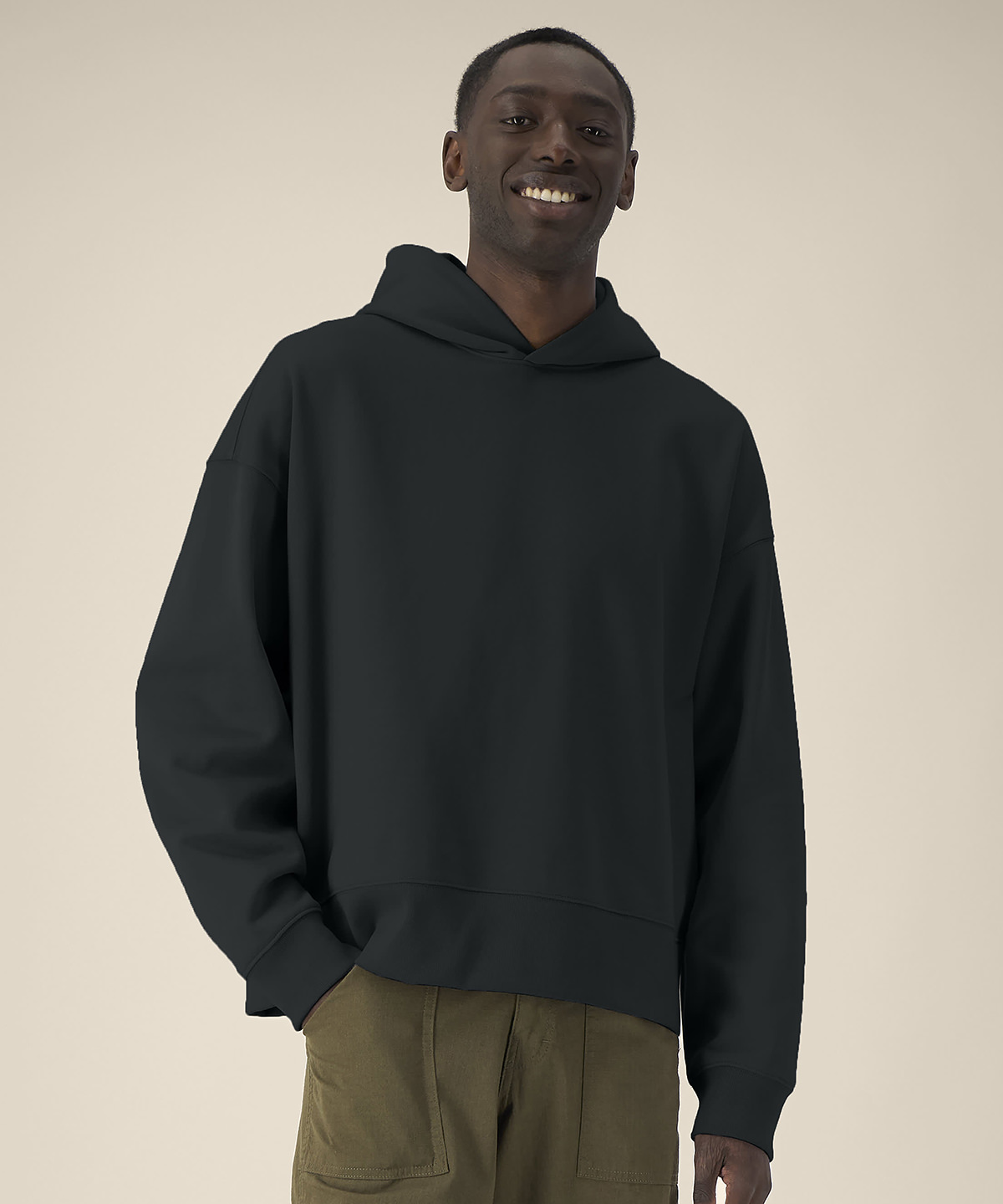 Unisex recycled cotton boxy hoodie. Set-in sleeves. Double-layered hood in self-fabric. 1×1 rib at sleeve cuffs and hem. Twin-needle topstitching on seams at shoulders, armholes, sleeve cuffs and hem. Inside herringbone back neck tape. Self-fabric half-moon at the back neck. Contains 50% GRS-certified recycled cotton and 50% OCS-certified organic cotton, certified by Control Union CB-CUC-1393082.